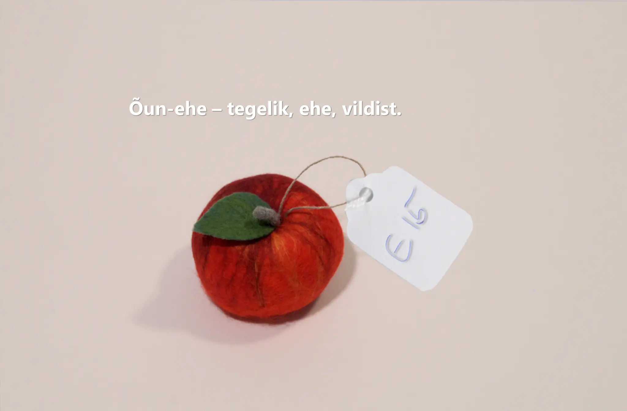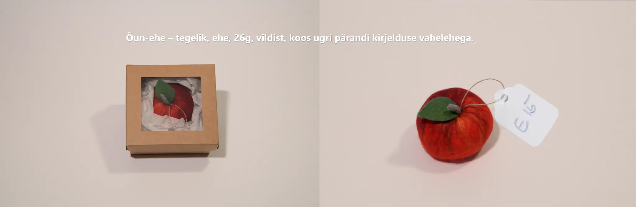 Õun-ehe – tegelik, ehe, 26g, vildist, koos ugri pärandi kirjelduse vahelehega. Õun on käsitöö, iga õun on omanäoline. Ära söö, tuleb vale mekk suhu!